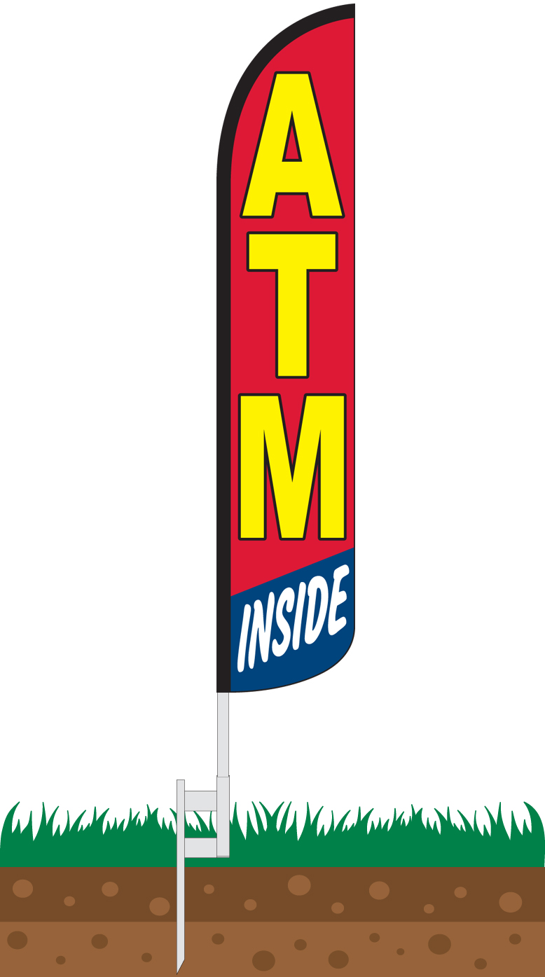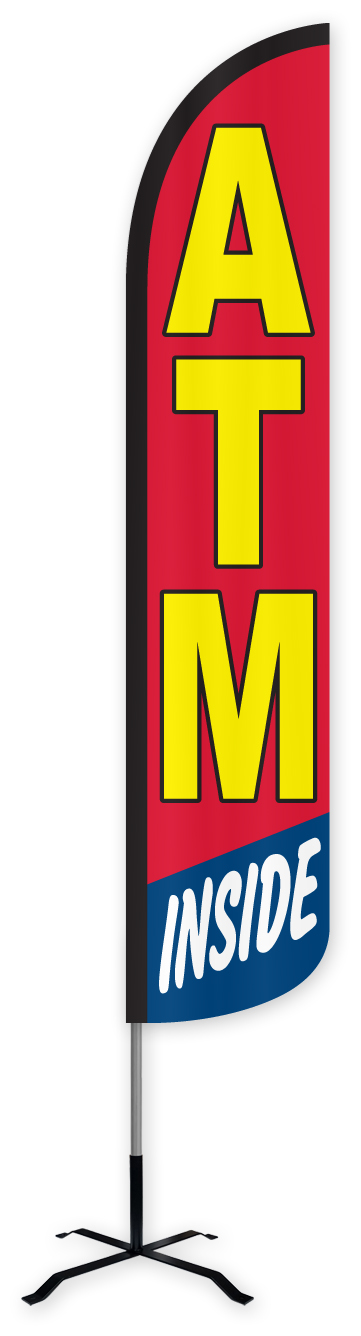 Our ATM Inside Wind-Free Feather Flag Features a red background yellow text outlined in black running down the flag that reads, "ATM." At the bottom of the flag is a blue field with bold white text running across that reads, "INSIDE." This flag is a great way for businesses to advertise that there is an ATM machine inside of their establishment.